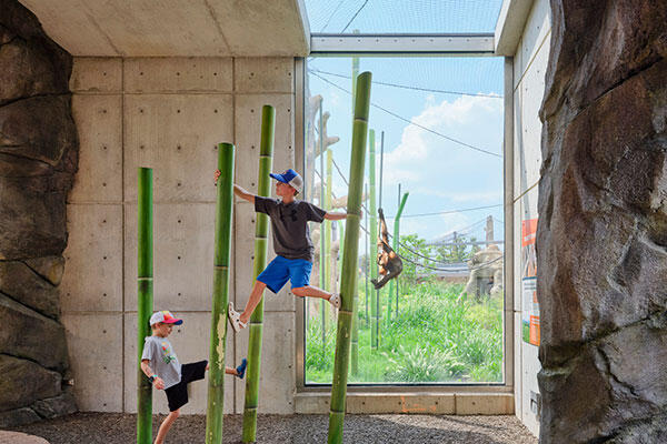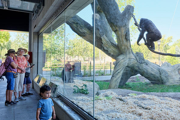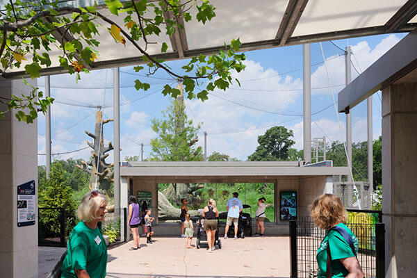 The outdoor habitat allows close-up viewing through glass structures as animals travel between interior environments and the outdoor spaces overhead. Waterfalls surrounded by natural and artificial trees and other features in the habitats provide animal enrichment and promote climbing behaviors as they would in the wild. Hollowed-out fallen trees offer unique viewing opportunities.